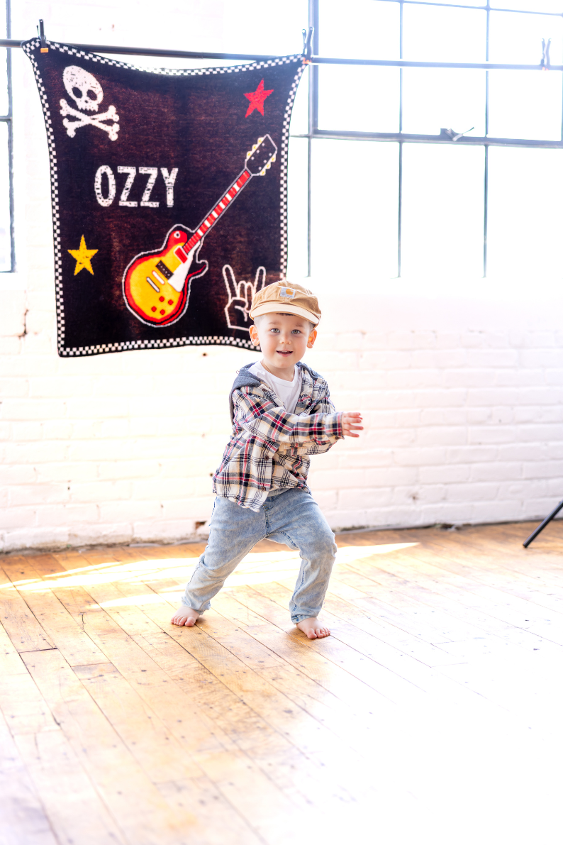 Give your babyโs room a rock โn roll edge โ a personalized knit blanket thatโs as cozy as it is cool.